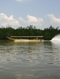 この辺りはマングローブの木が群生しています。TVとかでは見た事がありますが、本物を間近で見たのは初めてで、とても、感動しました。“船頭”さんも気の利く人で、写真を撮っていると、多少、船の速度を落としてくれます。・・・が速度が落ちる度に『エンジンのトラブルか?』とビビる自分の小ささが悲しい(笑) | |